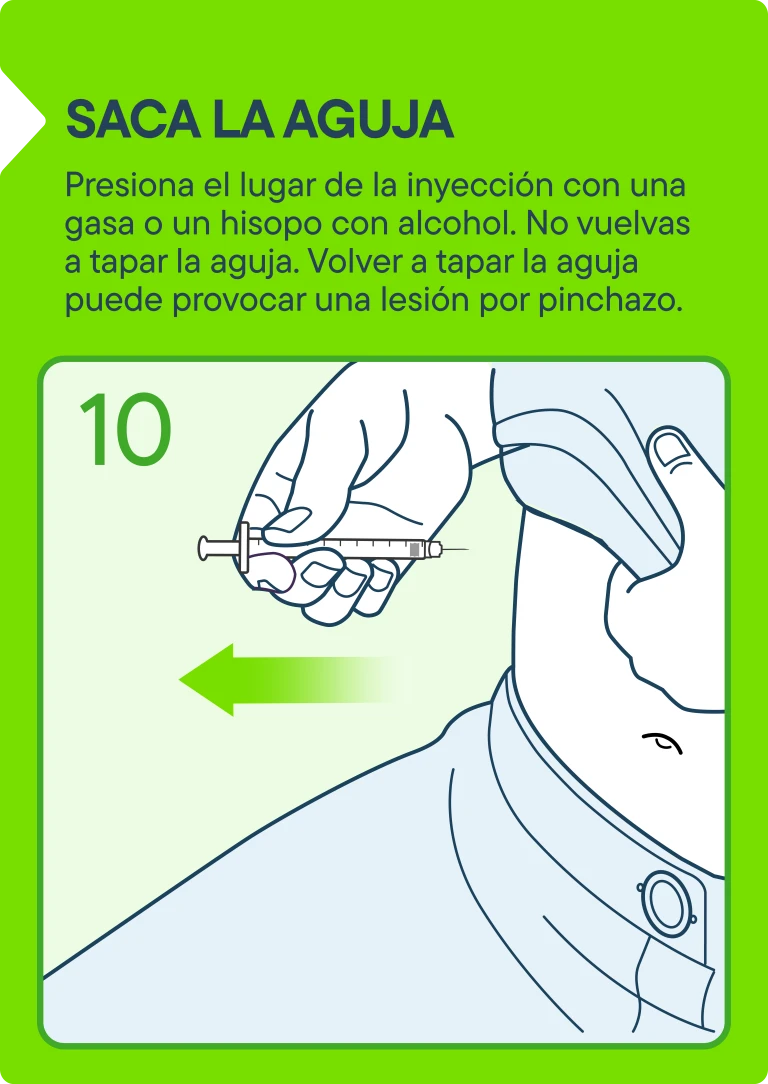 Saca la aguja. Presiona el lugar de la inyección con una gasa o un hisopo con alcohol. No vuelvas a tapar la aguja. Volver a tapar la aguja puede provocar una lesión por pinchazo.
