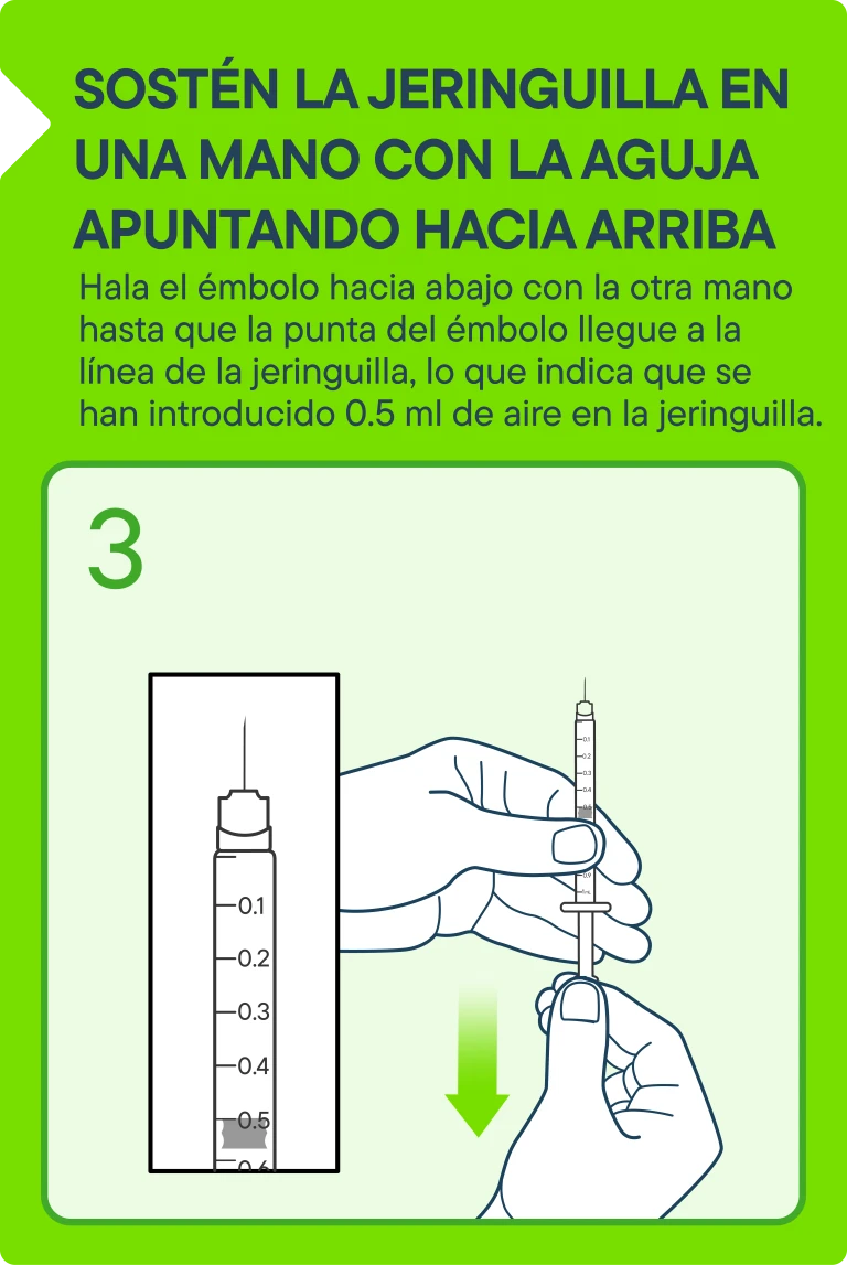 Sostén la jeringuilla en una mano con la aguja apuntando hacia arriba. Hala el émbolo hacia abajo con la otra mano hasta que la punta del émbolo llegue a la línea de la jeringuilla, lo que indica que se han introducido 0.5 ml de aire en la jeringuilla.