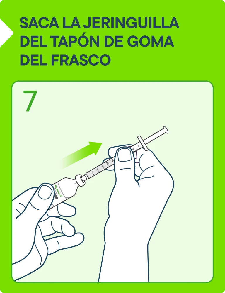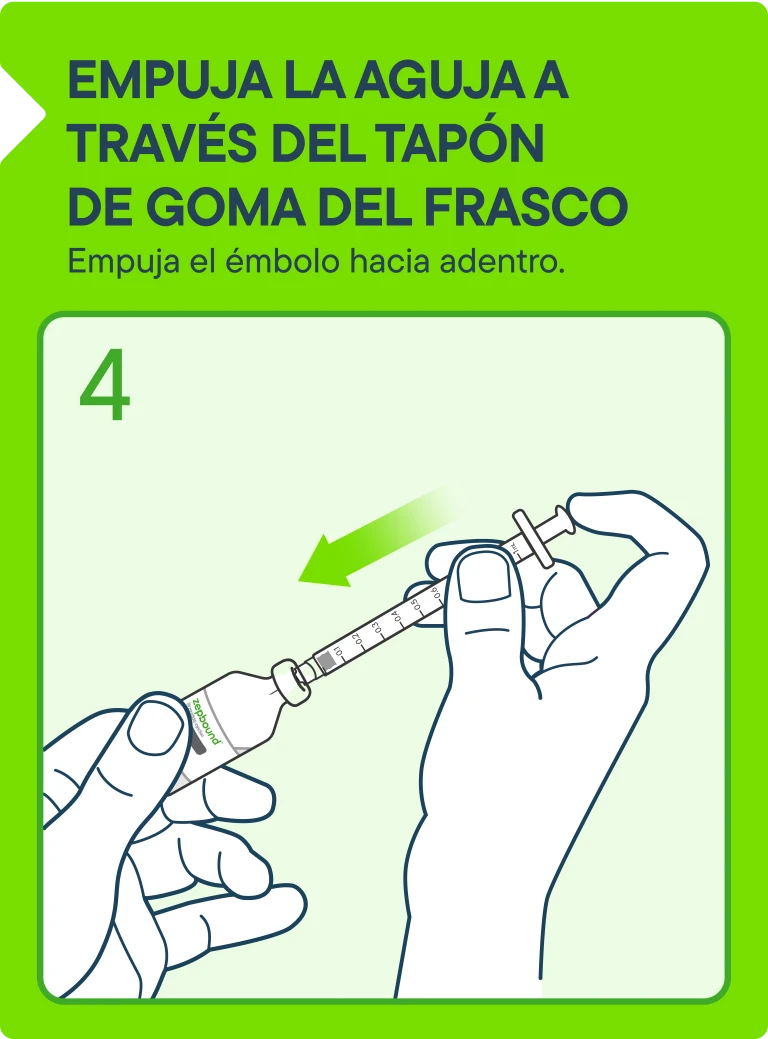 Empuja la aguja a través del tapón de goma del frasco. Empuja el émbolo hacia adentro.