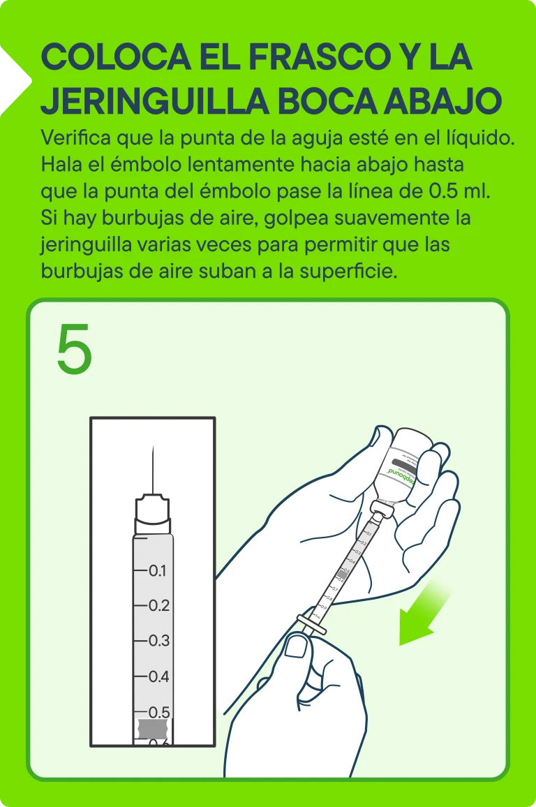 Coloca el frasco y la jeringuilla boca abajo. Verifica que la punta de la aguja esté en el líquido. Hala el émbolo lentamente hacia abajo hasta que la punta del émbolo pase la línea de 0.5 ml. Si hay burbujas de aire, golpea suavemente la jeringuilla varias veces para permitir que las burbujas de aire suban a la superficie.