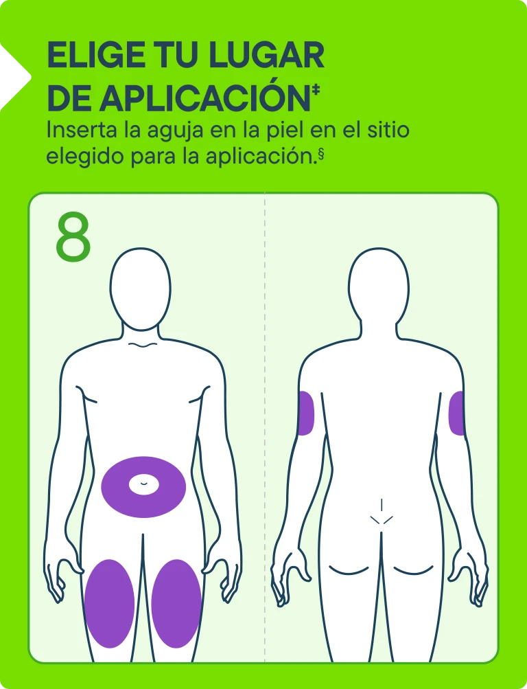 ‡ Elije el lugar de la inyección (por ejemplo, el estómago, el muslo o en la parte superior, atrás del brazo). Tú u otra persona puede inyectarte el medicamento en el estómago o en el muslo. Otra persona debe administrarte la inyección en la parte superior, atrás del brazo.