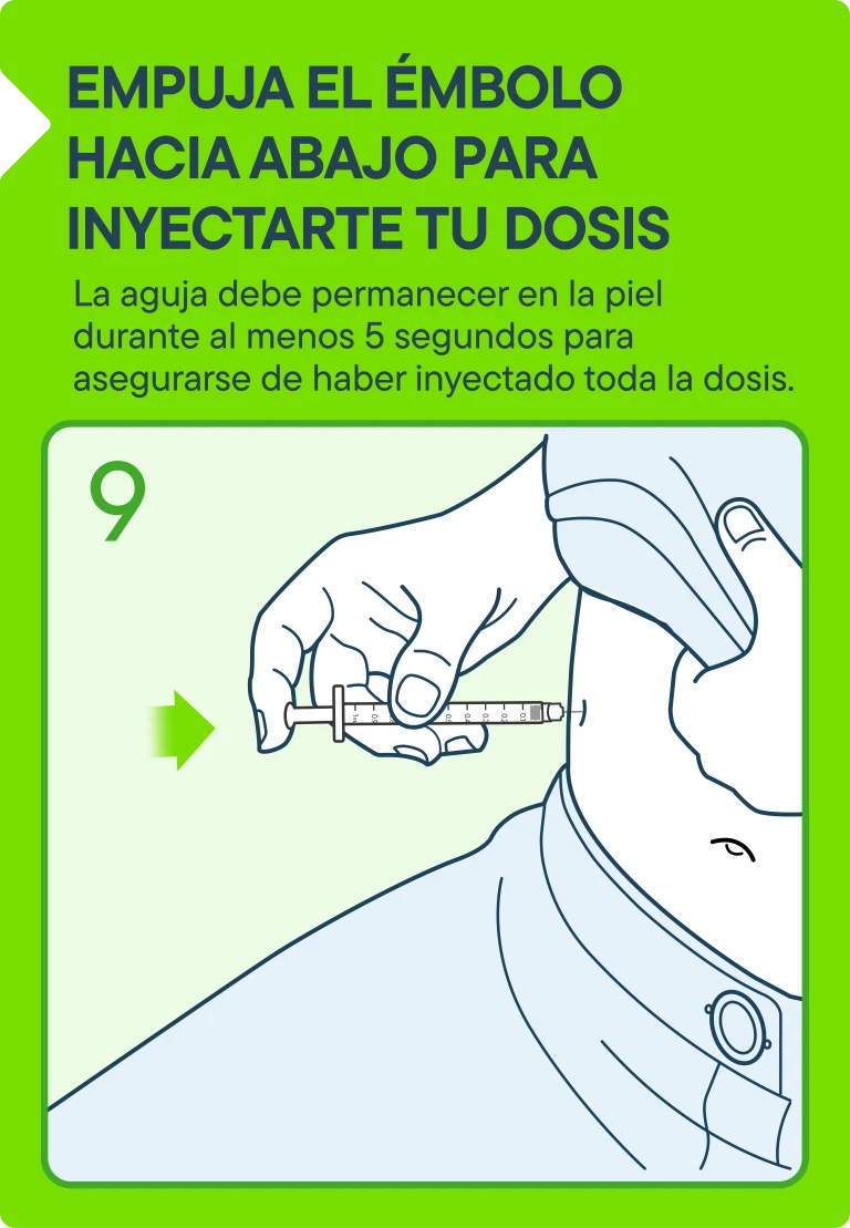 Empuja el émbolo hacia abajo para inyectarte tu dosis. La aguja debe permanecer en la piel durante al menos 5 segundos para asegurarse de haber inyectado toda la dosis.